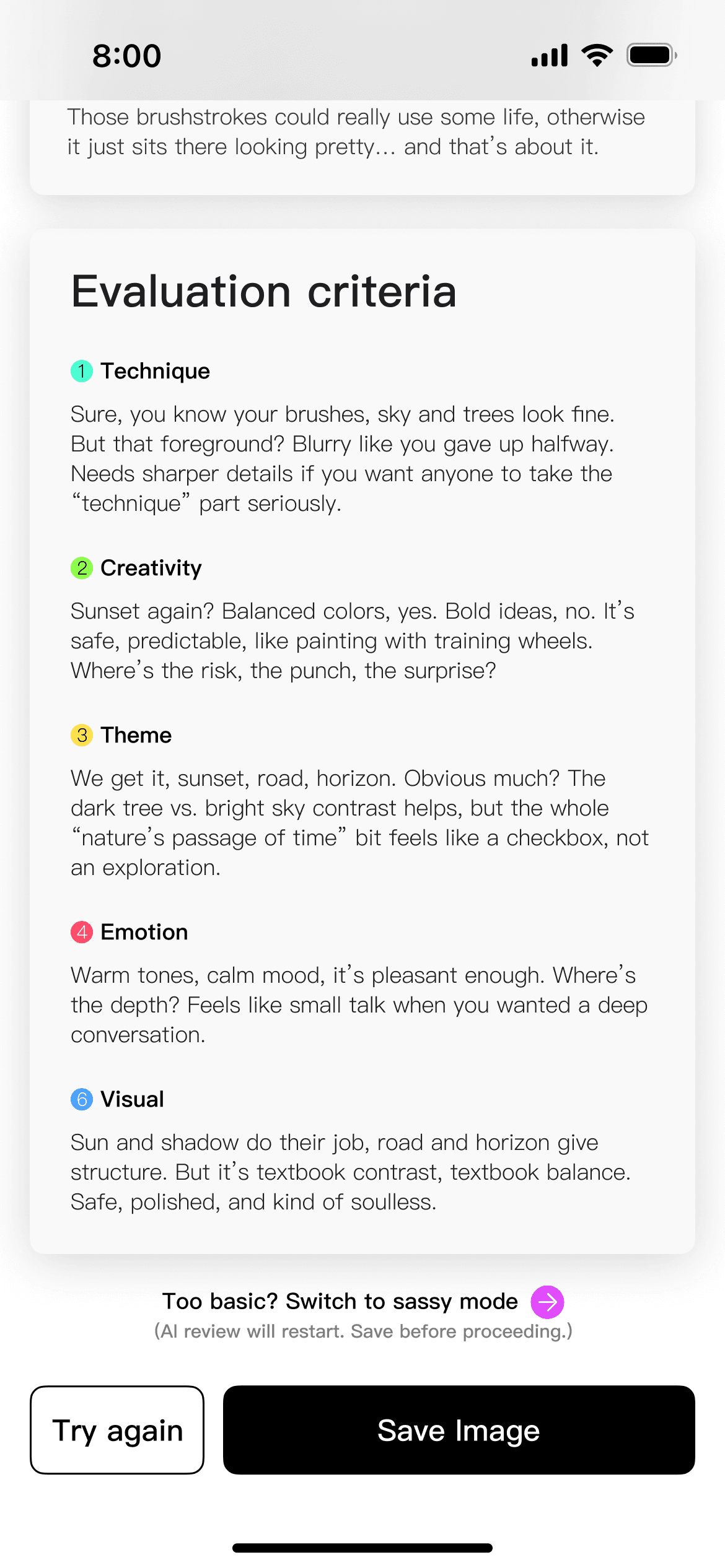 I realized that one of the biggest reasons people don’t fully trust AI evaluation is because it often feels…fake. AI loves to flatter you “Great job! Amazing work!” But after hearing it a dozen times, it just sounds like empty words. ArtiMuse takes a different approach. A sassy mode you can switch to. Where instead of endless praise, you actually get sharp, sassy, sometimes even a little mean feedback😉.