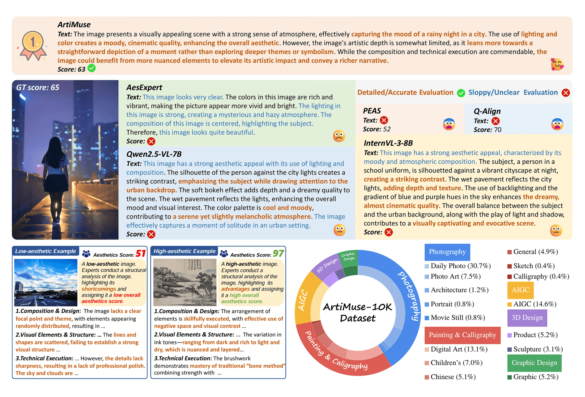 Released at WAIC 2025 with an expert-curated 10K dataset, ArtiMuse attracted 12K+ early users and received highly positive feedback. It surpassed previous models across the board in fine-grained evaluation.